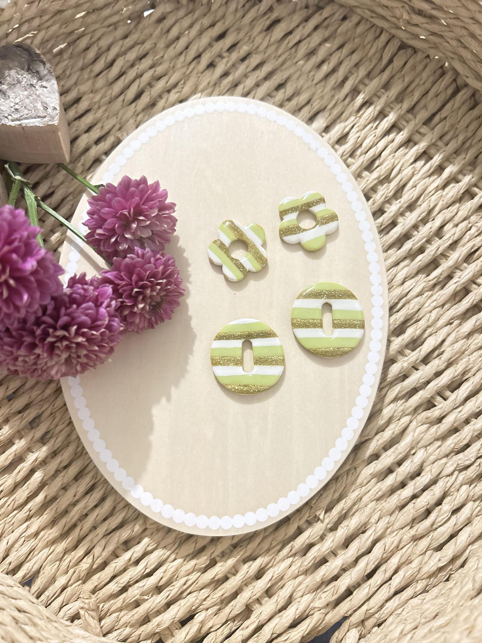 Différente pampilles rayées avec un joli vert, du blanc et des paillettes